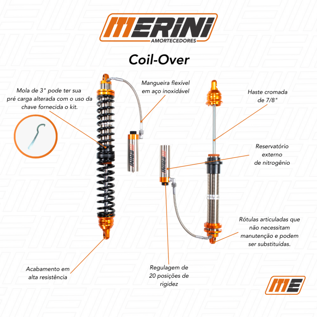 Para grandes desafios, precisamos de grandes soluções! Os Coil-Overs Merini foram desenvolvidos para enfrentar todos os tipos de pistas em Campeonatos Off-Road ou as trilhas mais exigentes.